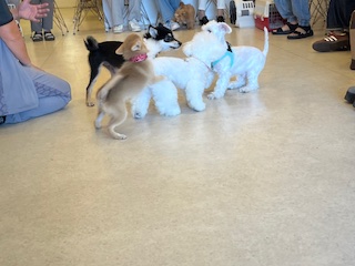 このように様々な性格の子たちとたくさん触れ合い、刺激を受けることによってわんちゃん同士の社会化を目指しましょう!7ヵ月までの子が対象となりますが、ご希望であれば何度でも参加可能となっておりますので、お気軽にお声がけくださいませ。