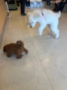 このように様々な性格の子たちとたくさん触れ合い、刺激を受けることによってわんちゃん同士の社会化を目指しましょう!7ヵ月までの子が対象となりますが、ご希望であれば何度でも参加可能となっておりますので、お気軽にお声がけくださいませ。